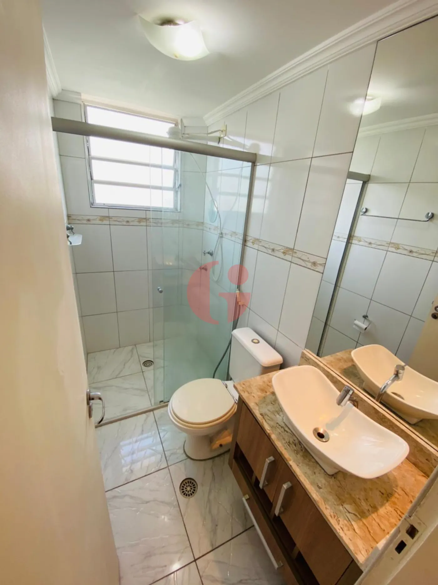 - Banheiro social com box de vidro e gabinete