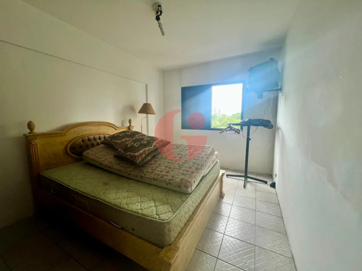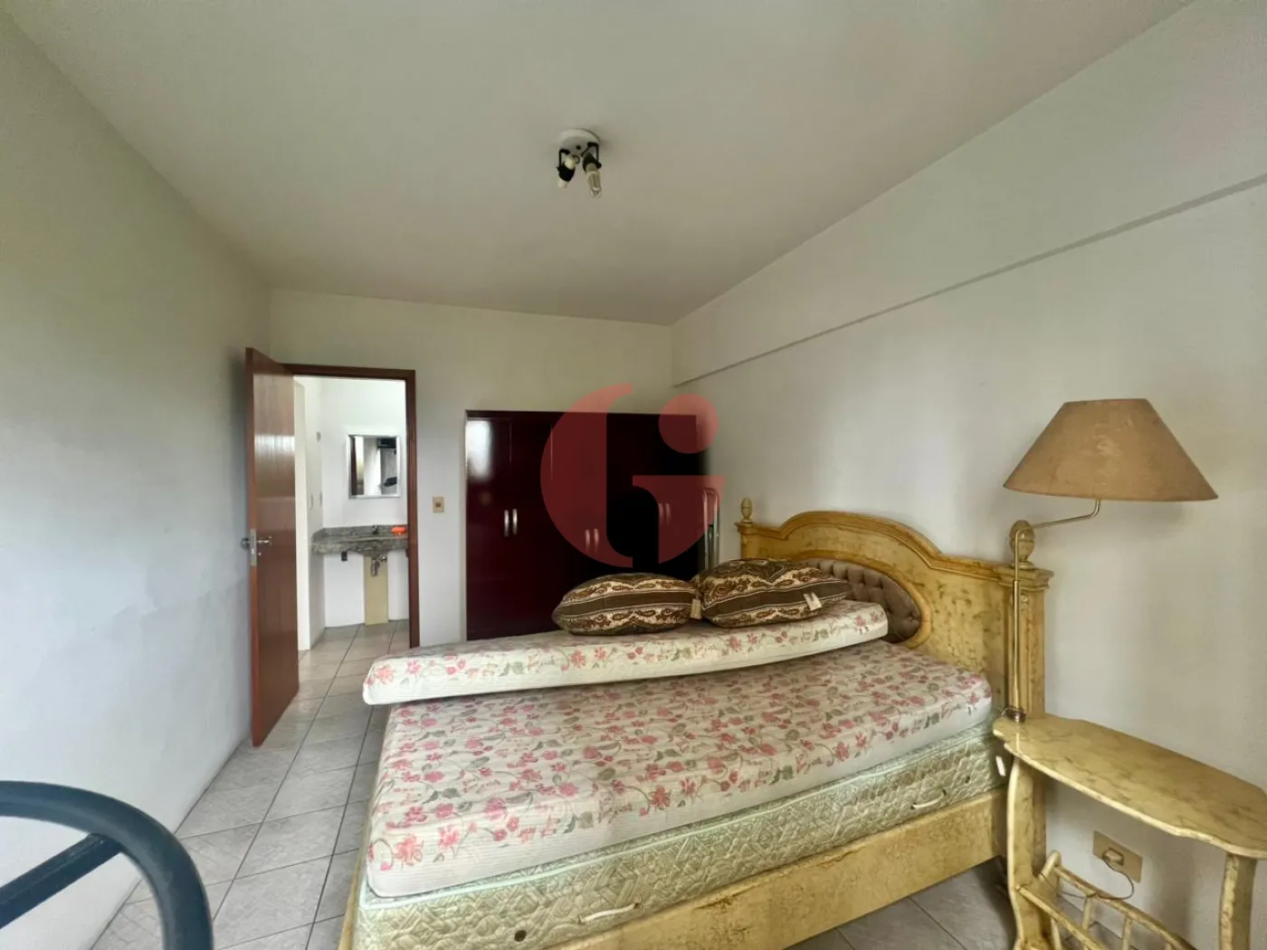 Dormitório com um guarda roupa, abajur, televisão, cama e colchão