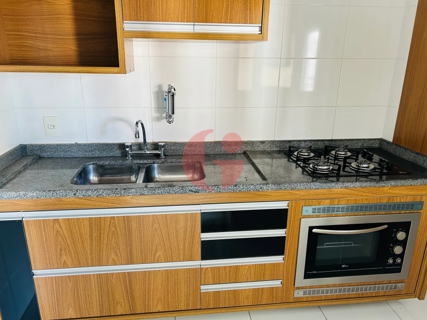 - Cozinha com armários e fogão cooktop integrado com forno