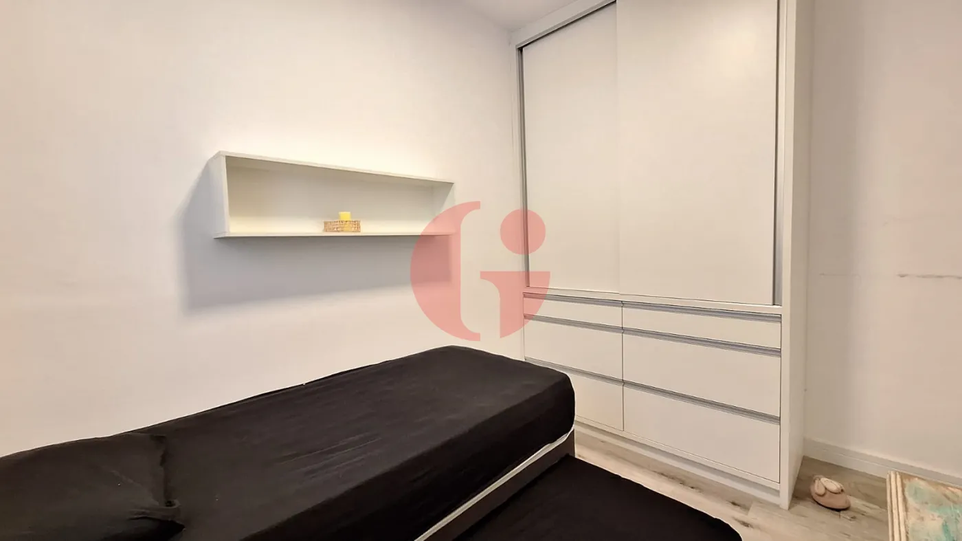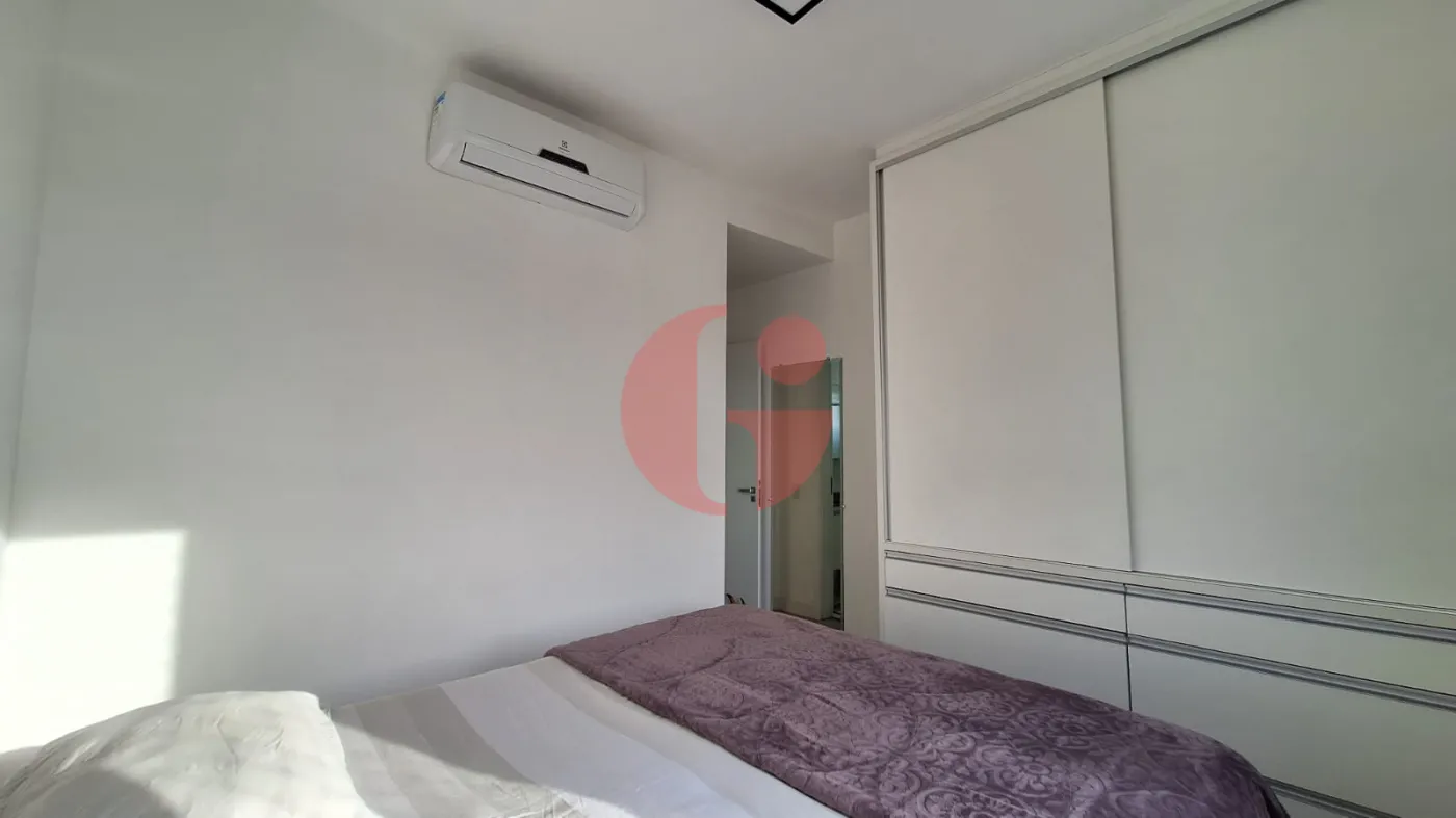 - 2ª quarto/suíte: Armários e prateleiras planejados com cama de casal, colchão, espelho, ar condicionado, piso laminado