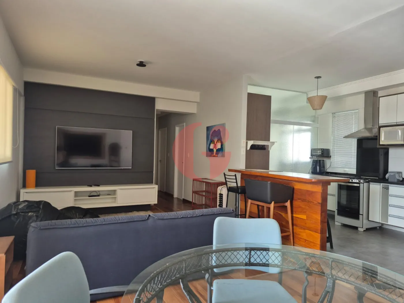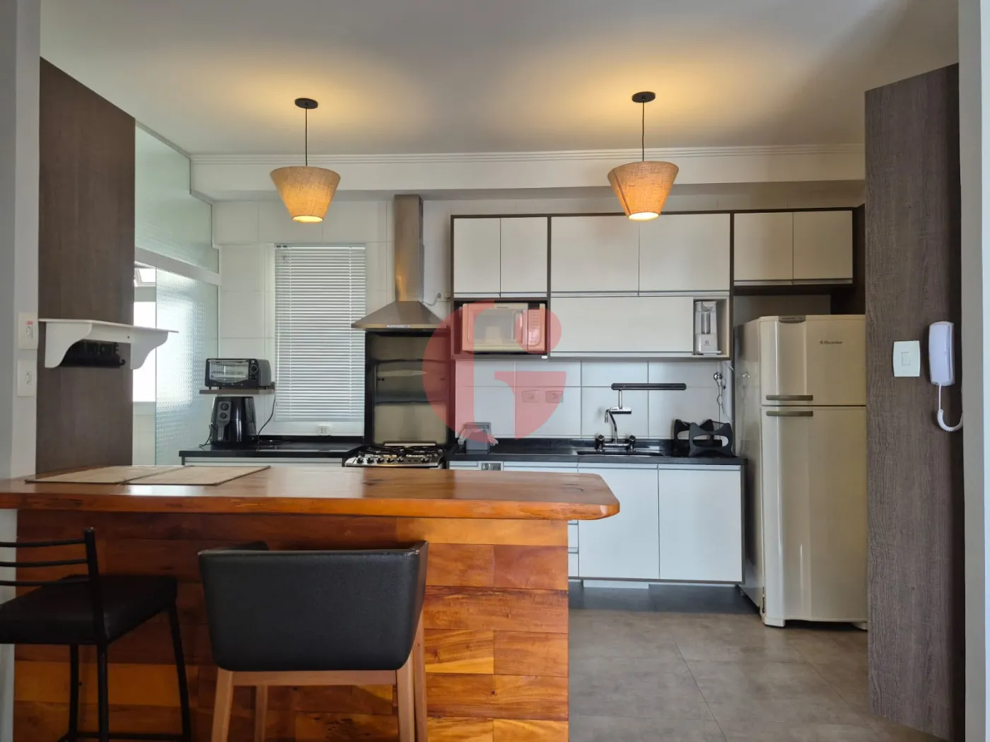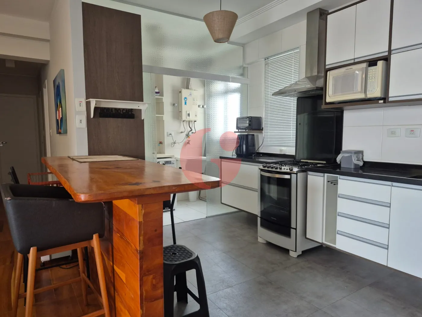 - Cozinha estilo americana, aberta com balcão de madeira
