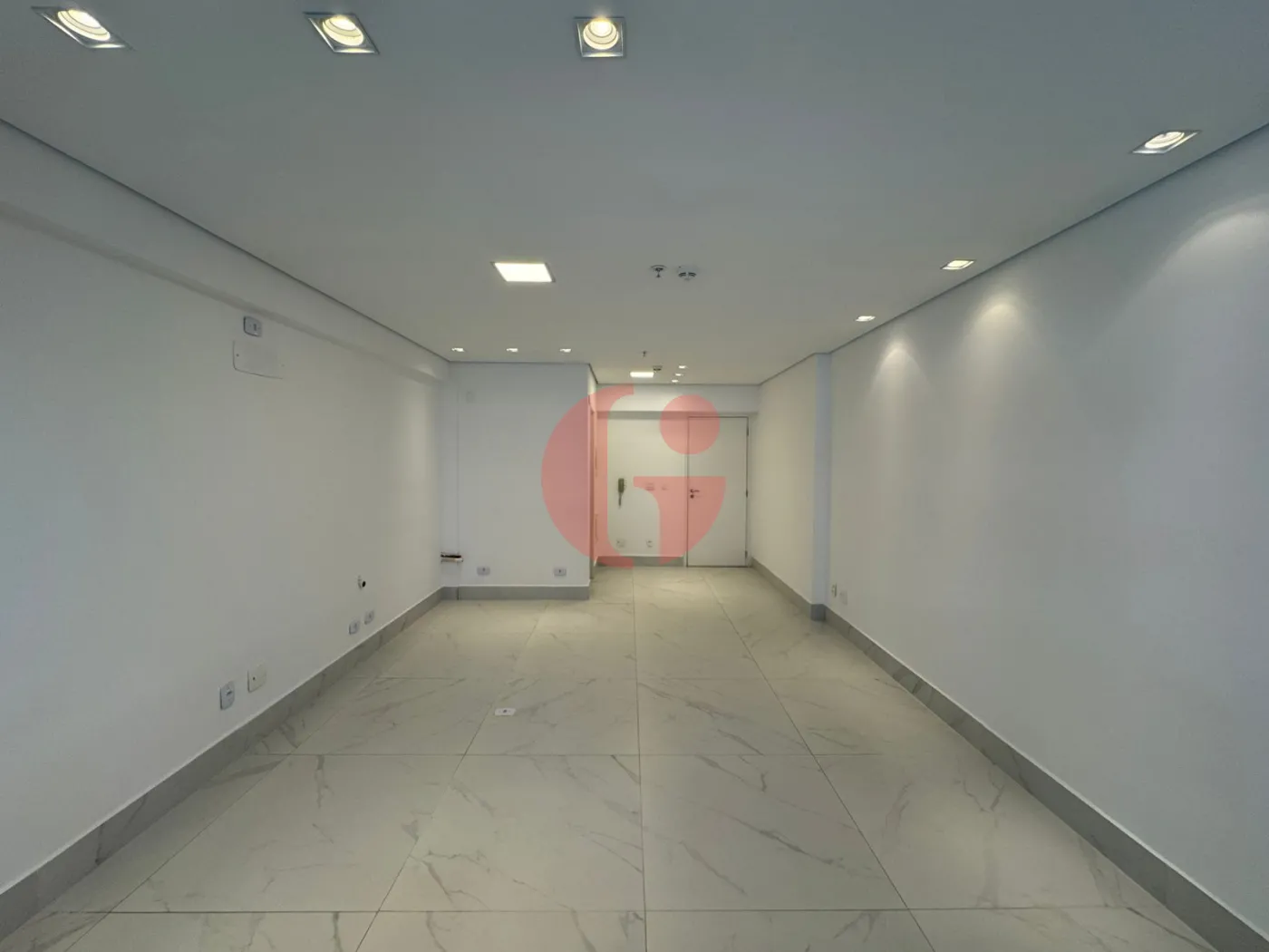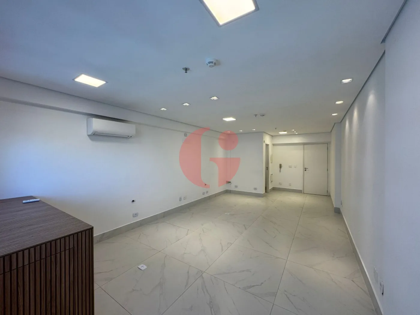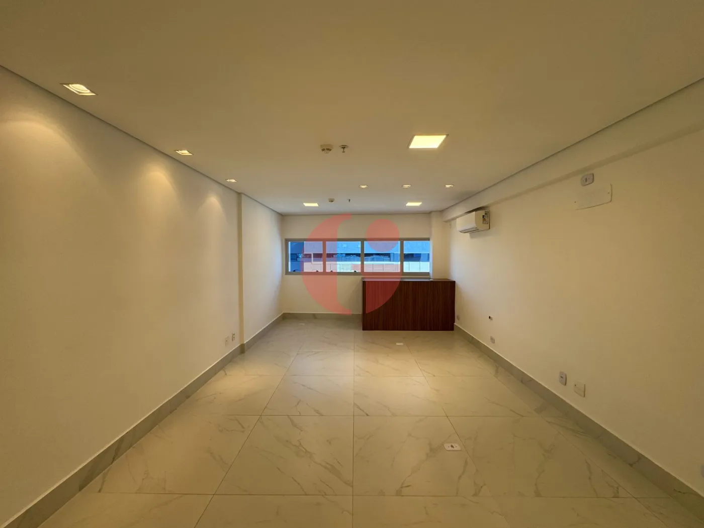 Sala com metragem de 35,63m², com piso porcelanato, teto com rebaixamento em gesso, ar condicionado, 1 banheiro privativo com piso frio e 1 vaga de garagem no subsolo rotativa.