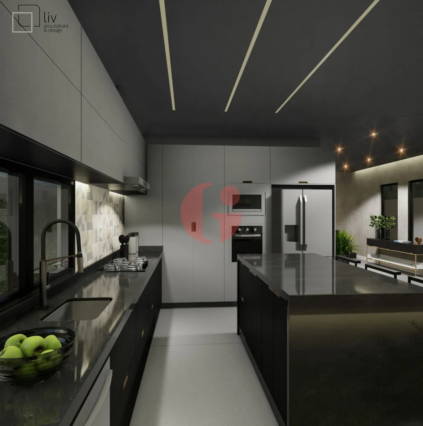 - Cubas dos banheiros e lavabo esculpidas em porcelanato e Silestone, metais Deca e Docol, sendo o da cozinha com filtro embutido