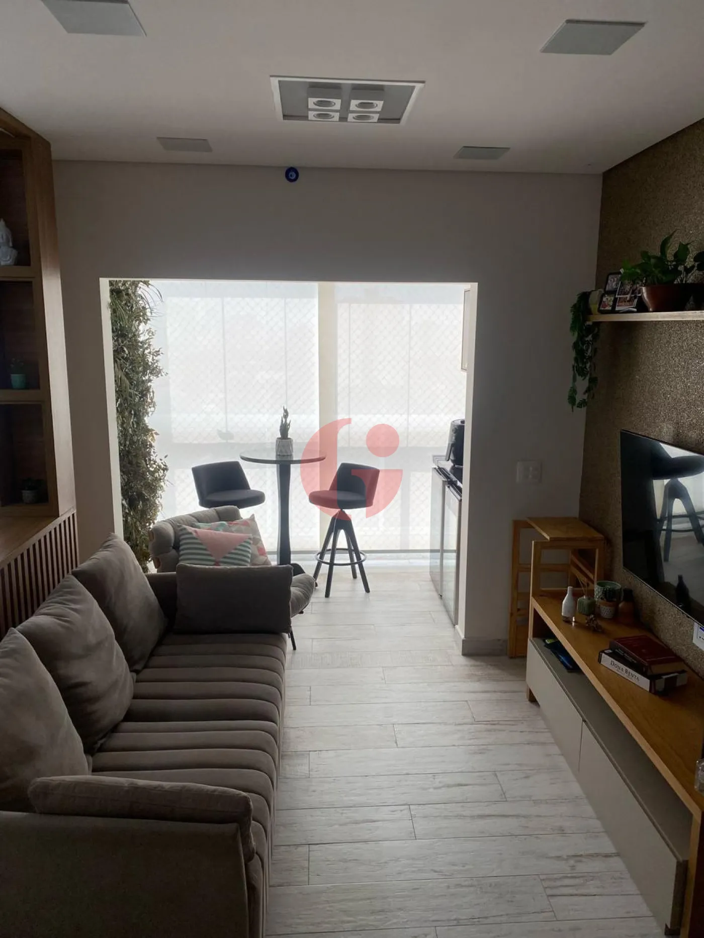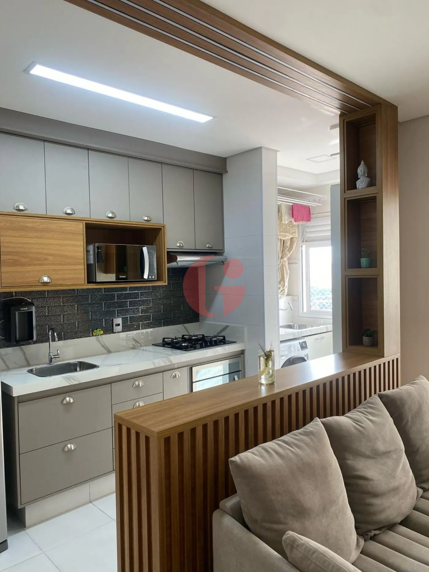 - Varanda com guarda-corpo de vidro e alumínio com acesso à cozinha