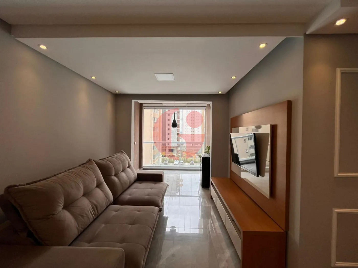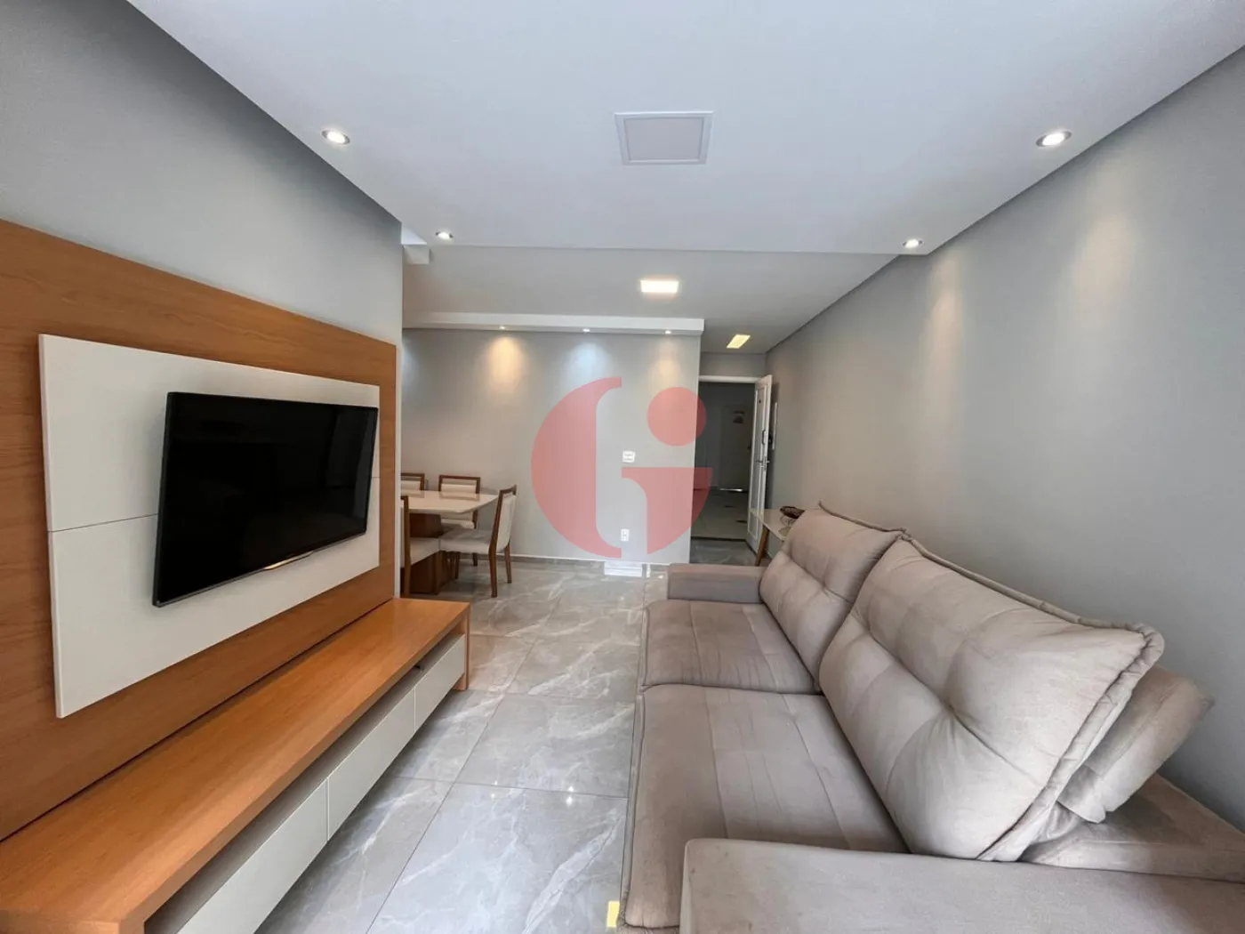 - Sala de estar com sofá, painel da TV, rack, televisão