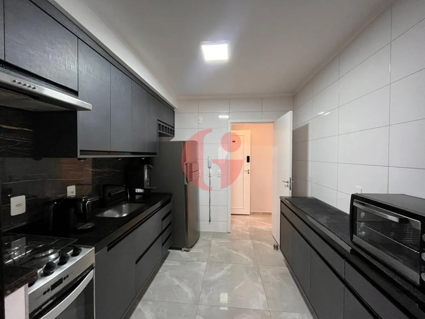 - Cozinha com armários planejados, fogão, geladeira, forno elétrico, filtro de água, cafeteira