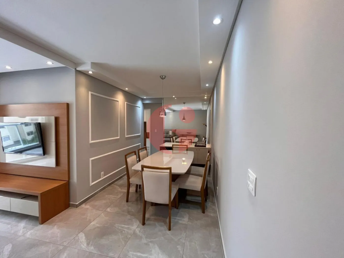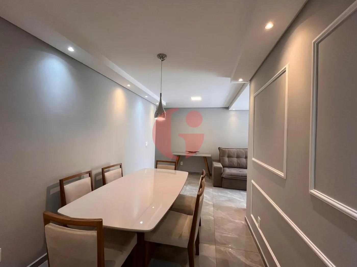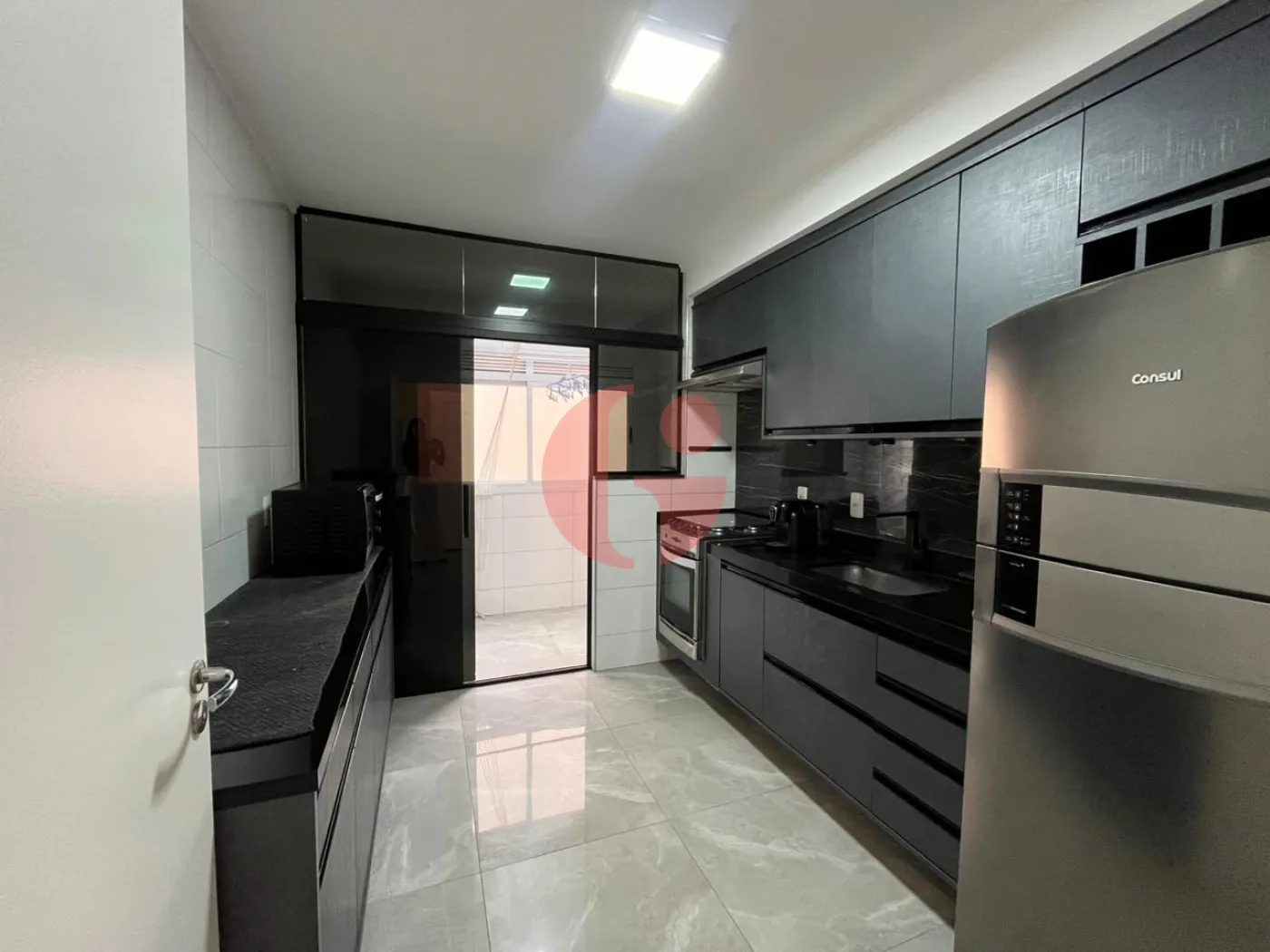 Diferenciais: Porcelanato, gesso, teto rebaixado e iluminação em led, cozinha com armários planejados cor cinza chumbo com puxadores pretos brilhantes, pia em pedra São Gabriel, torneira preta fosca, vidraça fumê com porta de correr separando a cozinha da área de serviço, sala com três ambientes, banheiro com pias feitas com quartzo branco, box de vidro espelho até o teto e torneiras modelo cascata monocromador.