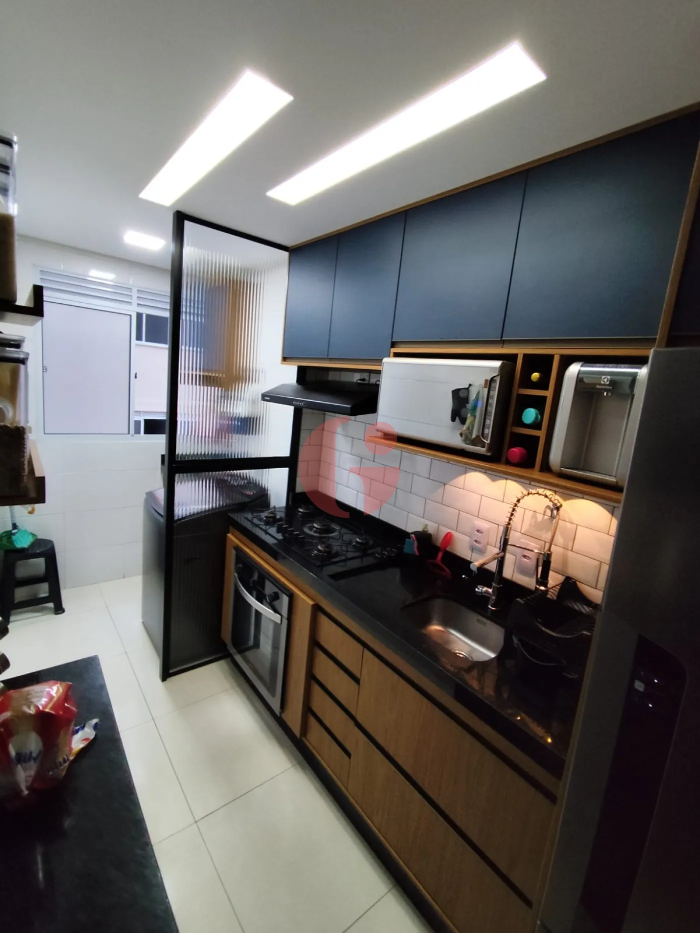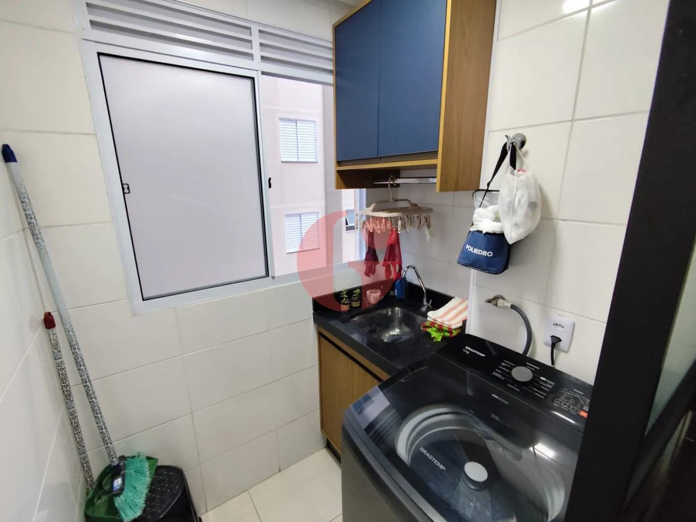 - Lavanderia separada por divisória de vidro e com armários