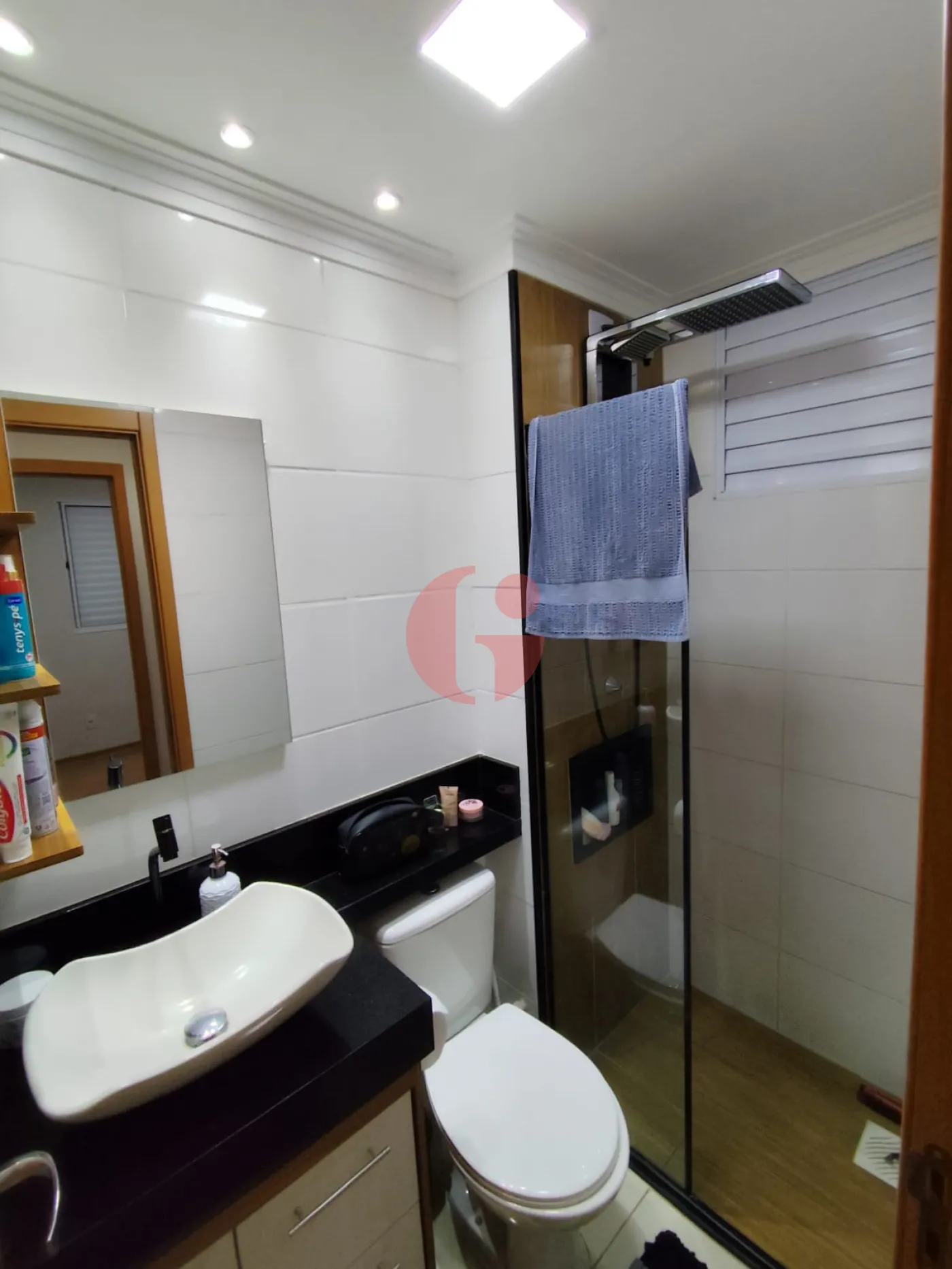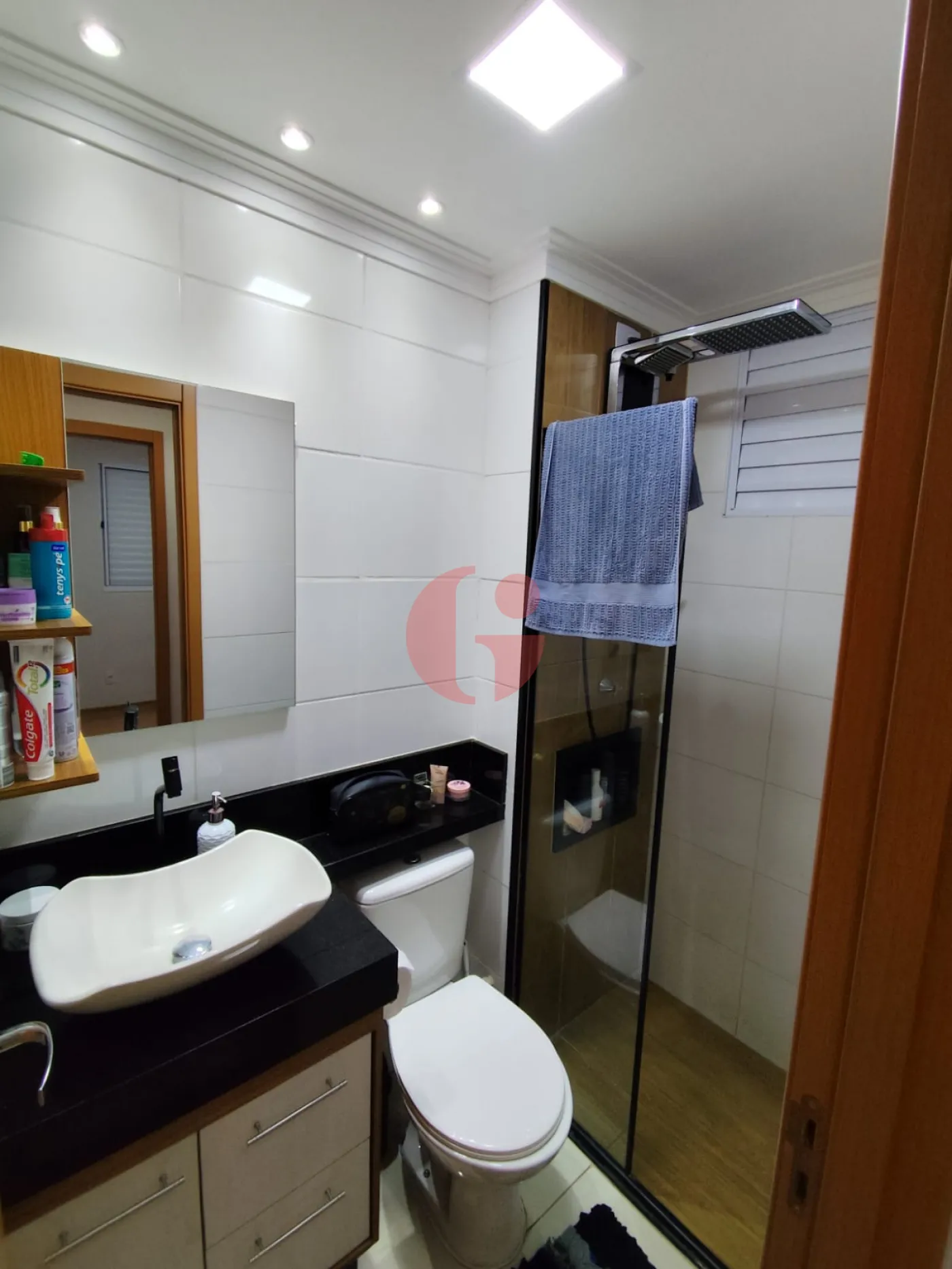 - Banheiro com gabinete, espelho e box de vidro.