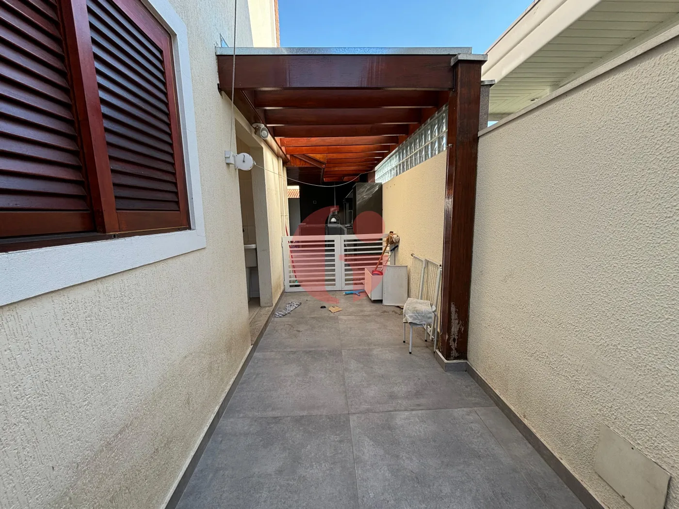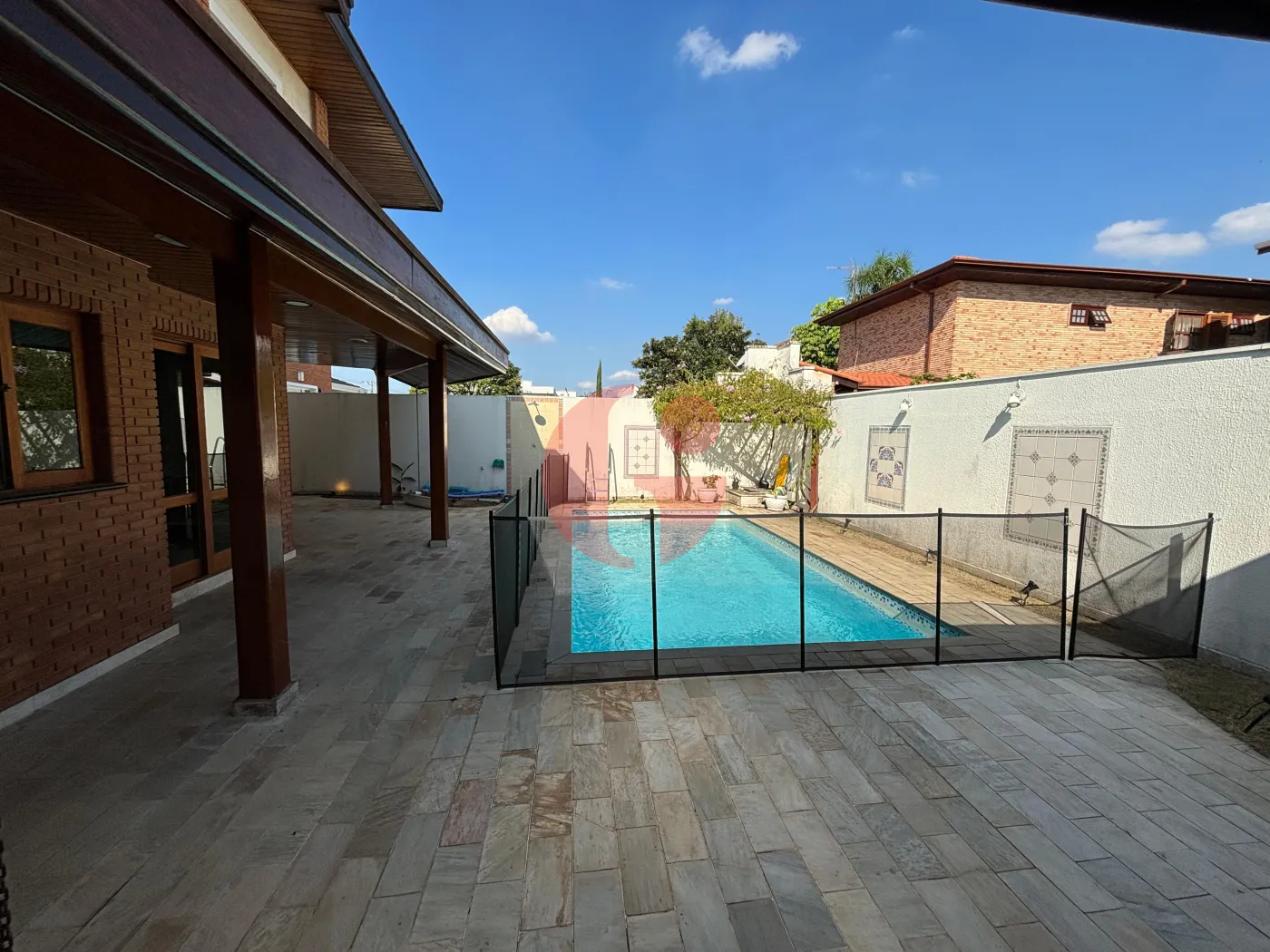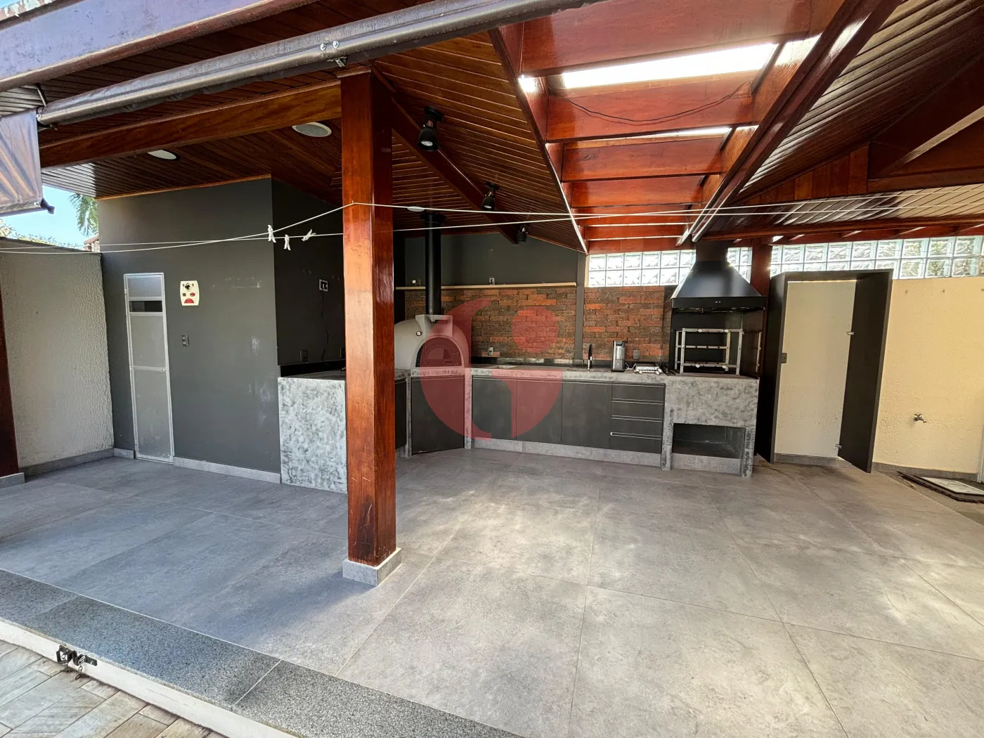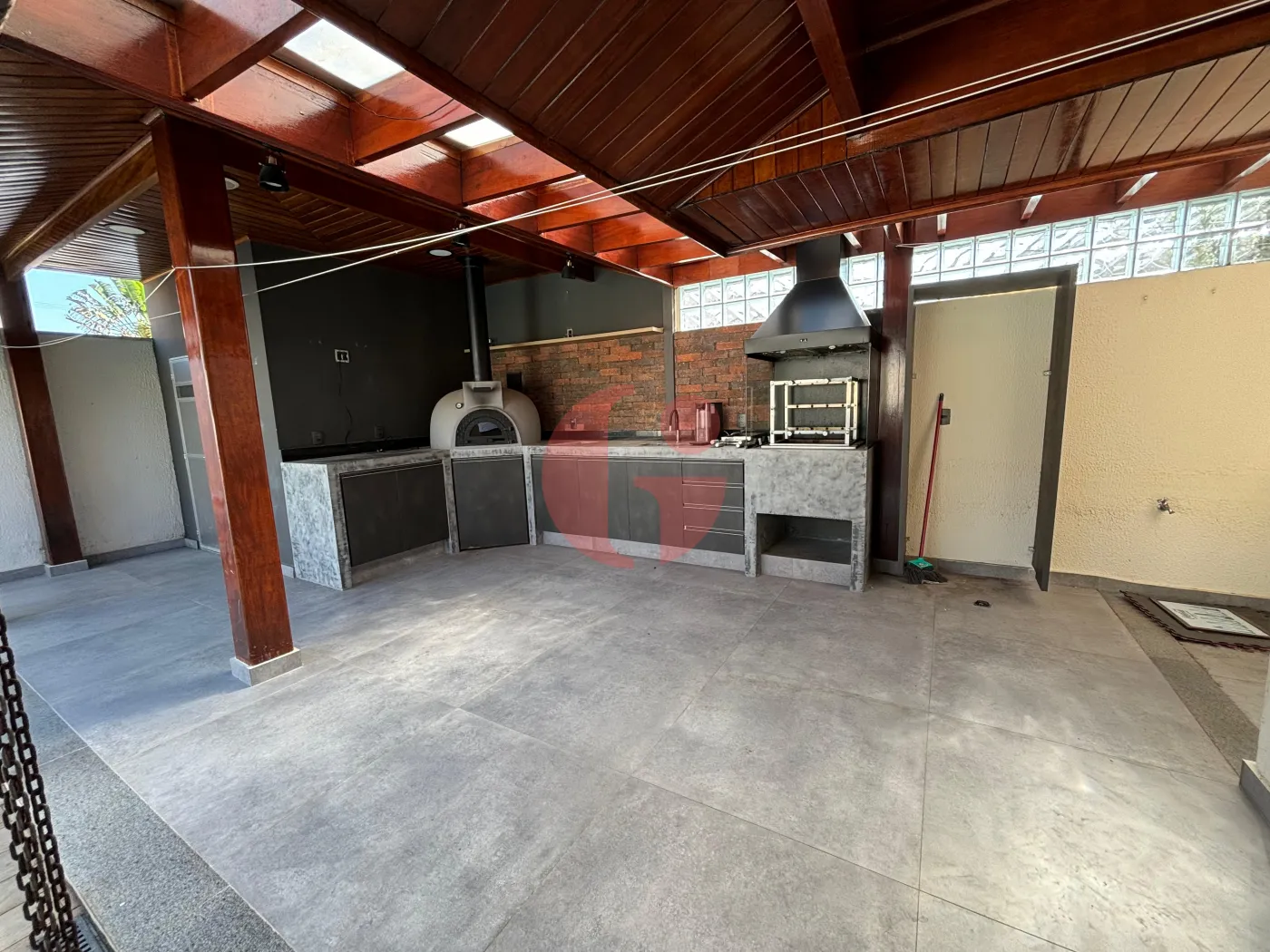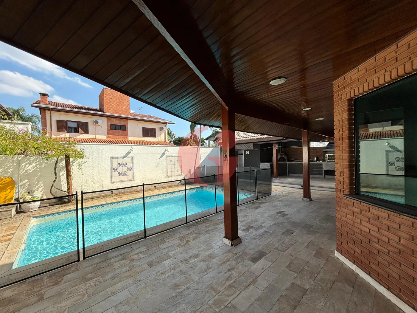 Área externa da casa ampla e moderna, com piscina, sauna, churrasqueira e forno de pizza, WC e jardim!