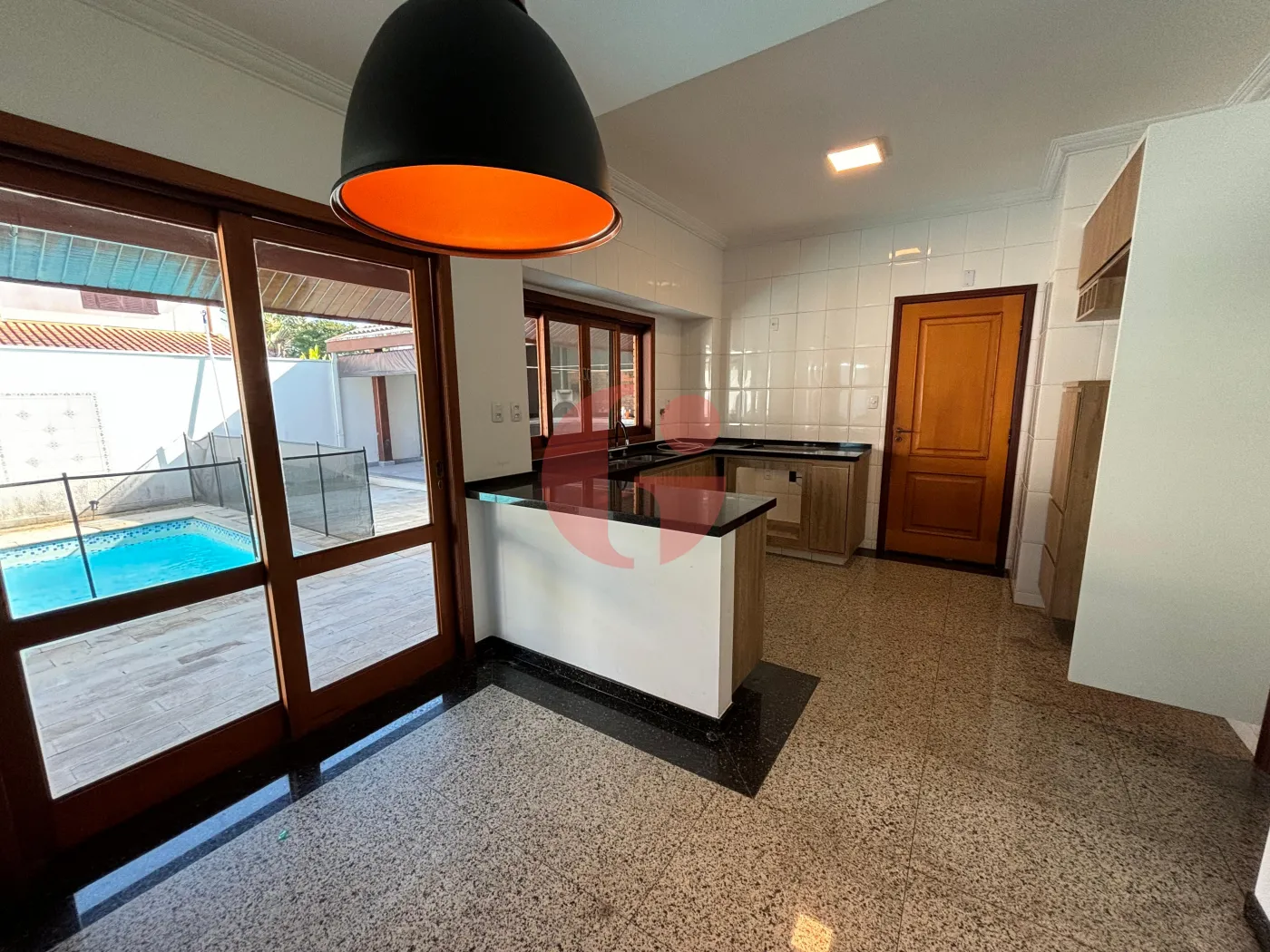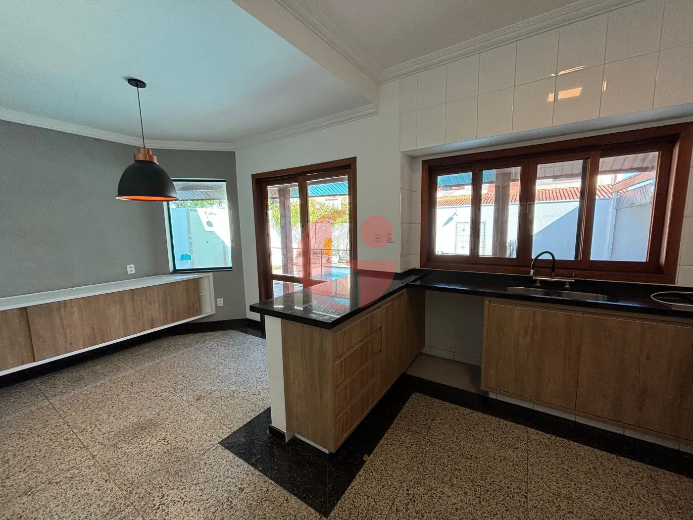 - Ampla e moderna cozinha, com bancada, armários e despensa