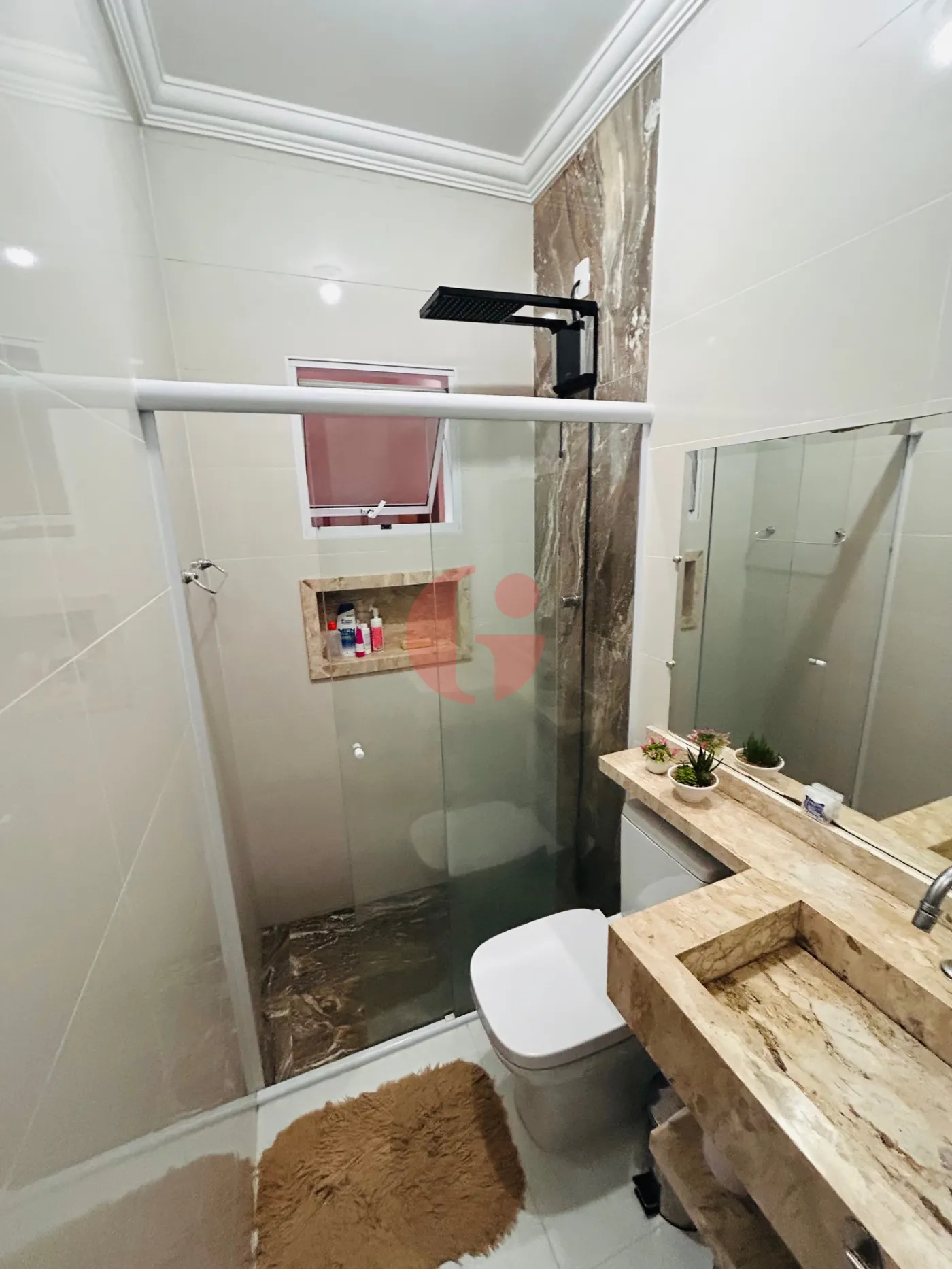 - Banheiro social e suíte com pia suspensa em mármore e Box Blindex vidro, piso frio